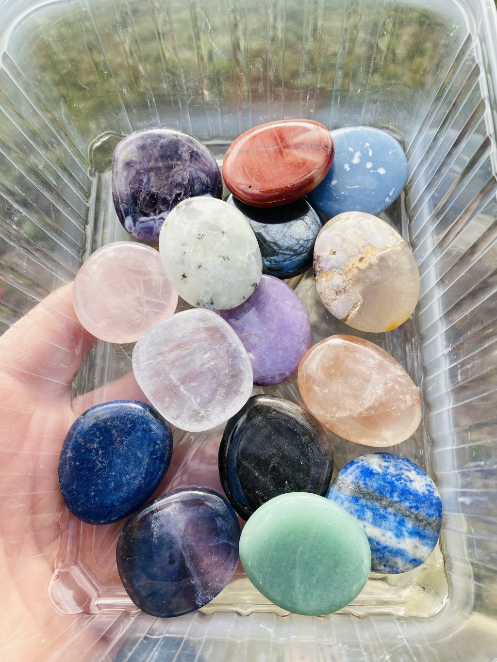Sada obsahuje :kalcit,angelit,mokait,ametyst,růženín,hematit,fluorit,lepidolit,avanturín,sodalit,lapis lazuli,obsidián,dendrický opál,achát,hematoid
